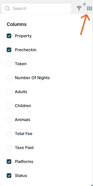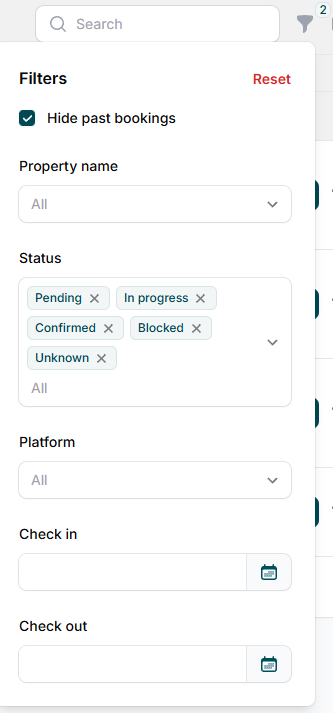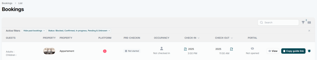 Your bookings list can grow quickly, so we provide helpful tools to easily locate specific bookings when needed. Use the search bar to find bookings by guest name, property, or other identifiers.