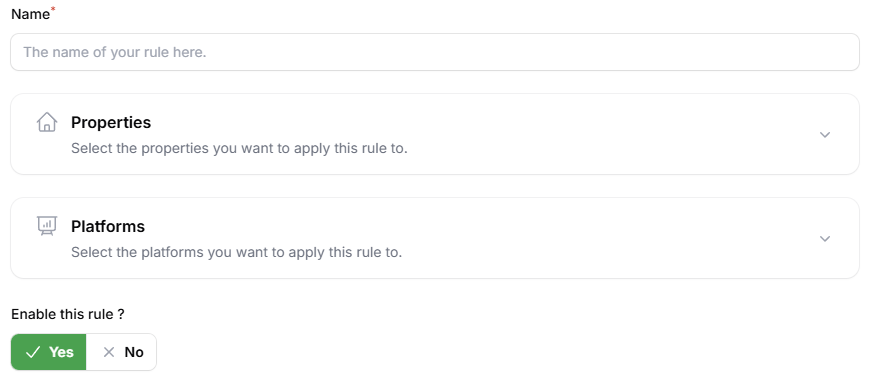 When creating a rule, you can define a name for it and specify which properties and platforms it should apply to. You also have the option to enable or disable the rule at any time, depending on your needs.