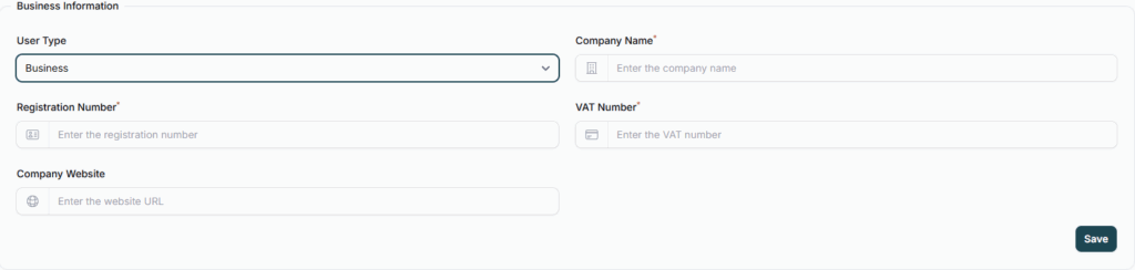 If you select “Business” as your user type, you’ll be prompted to provide key company details.